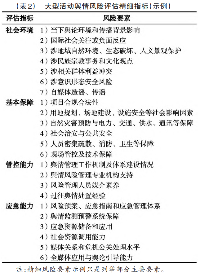 2. 大型活动舆情风险的精细指标。除了作为识别舆情重大风险的综合“五性”指标外,进行大型活动舆情风险识别过程中,更多的精细化评估指标,有利于深入识别和分析各项舆情风险因素,进行风险全覆盖,确保舆情风险内控体系的建设(见表2)。