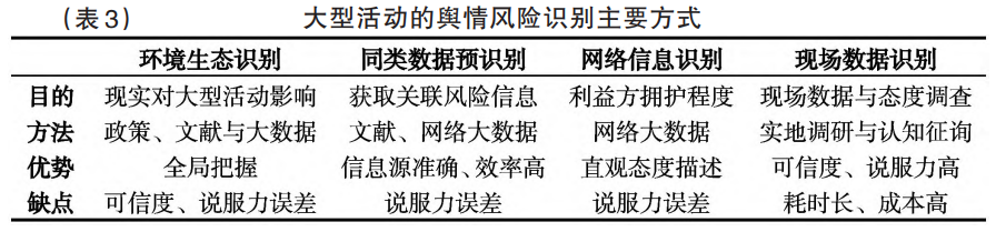 在舆情风险事故或情况发生之前,可以通过对大型活动舆情风险进行全面的环境生态识别、同类数据预识别、网络信息识别和现场数据识别(见表3),分析可能引发舆情风险事故的潜在原因、发生概率和损害影响的严重程度,为舆情风险的分类定级提供充分依据。