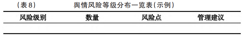 ③关键风险分类的结果呈现。根据关键风险分类评估指标的呈现结果,形成关键风险评估表(见表7)、舆情风险等级分布一览表(见表8)。