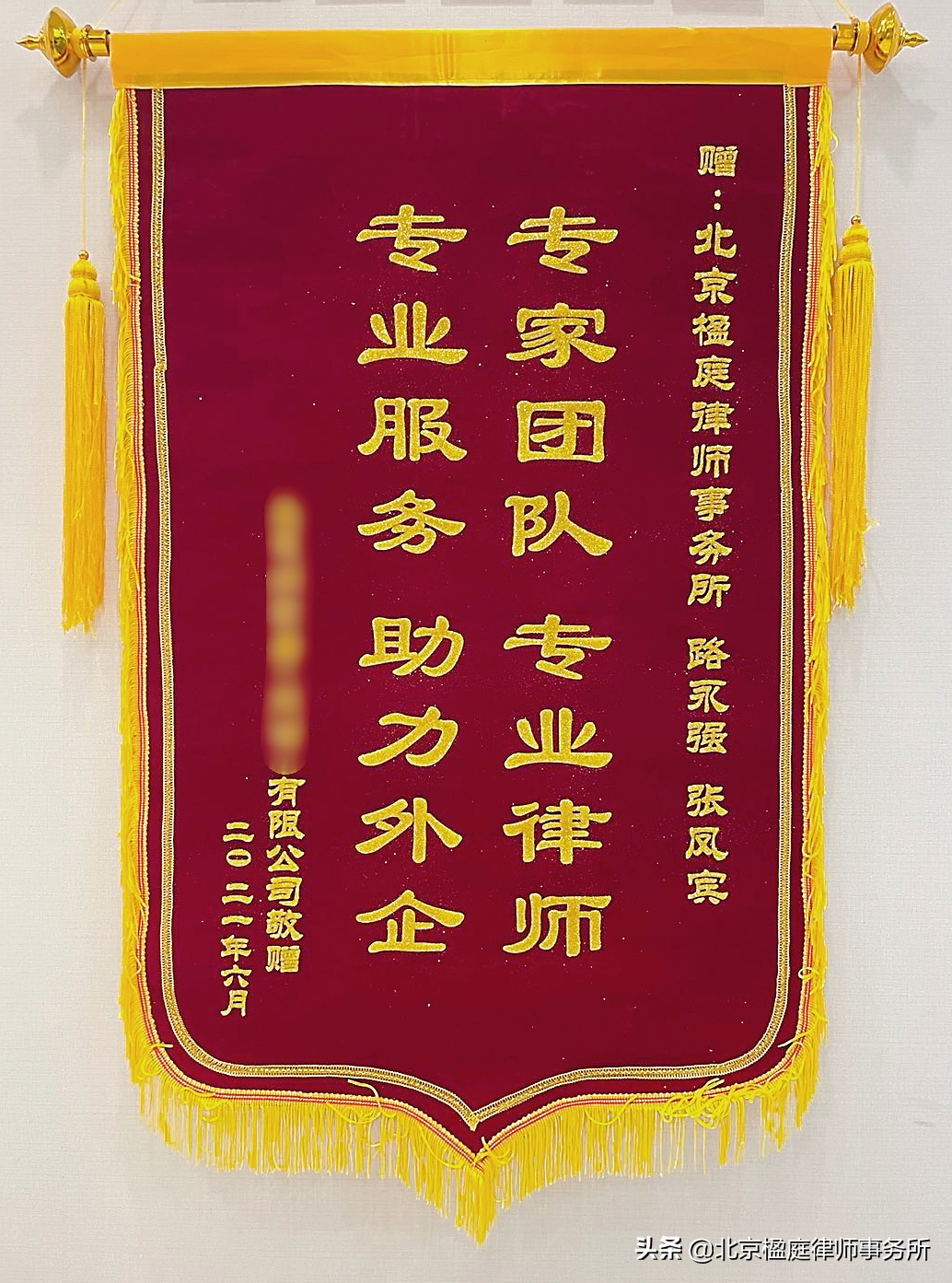 外资企业特向楹庭律所赠送锦旗,表达对路永强律师、张凤宾律师及楹庭团队感谢。“专家团队、专业律师、专业服务、助力外企”十六个字表达了该企业对楹庭律所团队的认可。