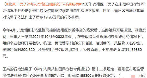 北京一男子就是因为联系了多名教师,在没有培训机构许可证的前提下,给接近40多名学生在暑假期间进行学科类的教育培训。