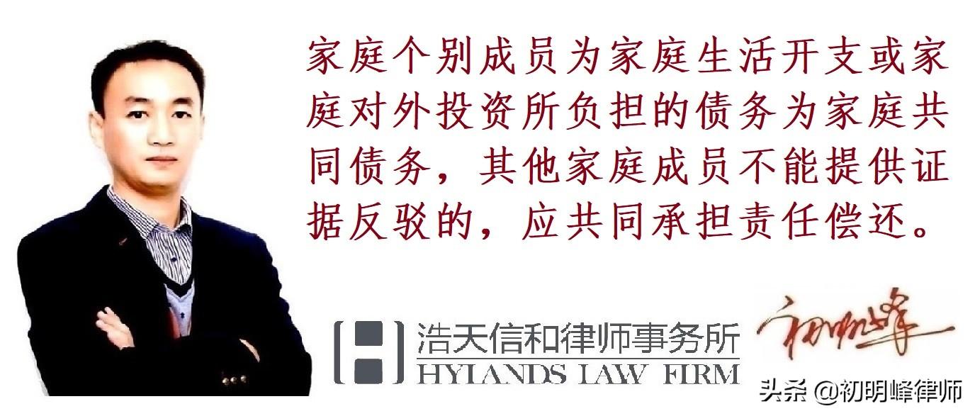 家庭个别成员为家庭生活开支或家庭对外投资所负担的债务应为家庭共同债务,所有家庭成员应共同承担。家庭中其他非直接负债成员抗辩不承担责任需证明所负债务为该家庭成员个人债务。
