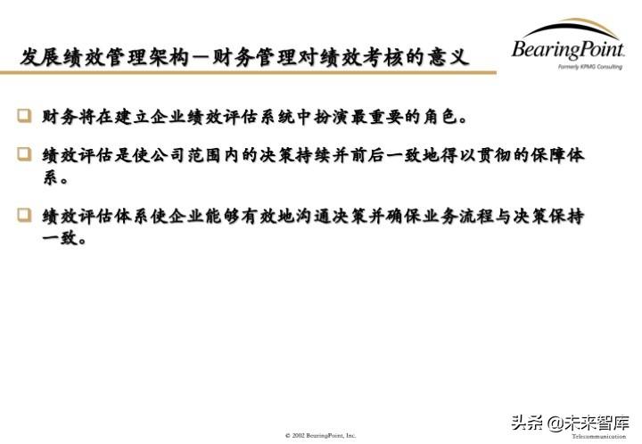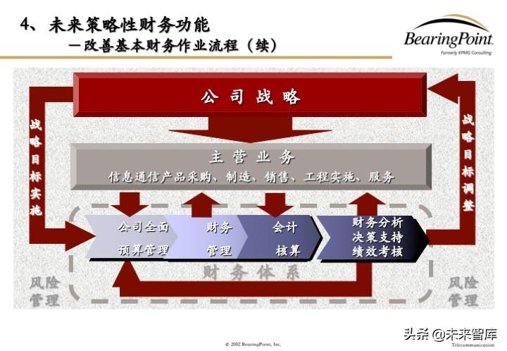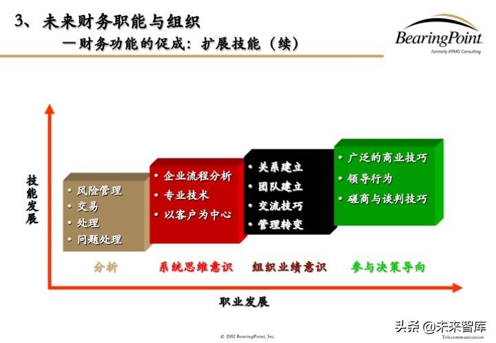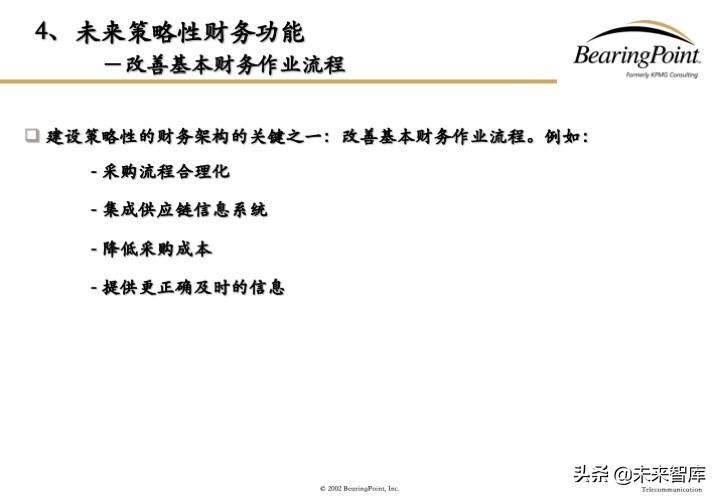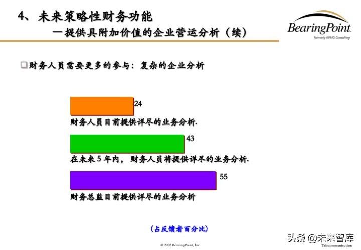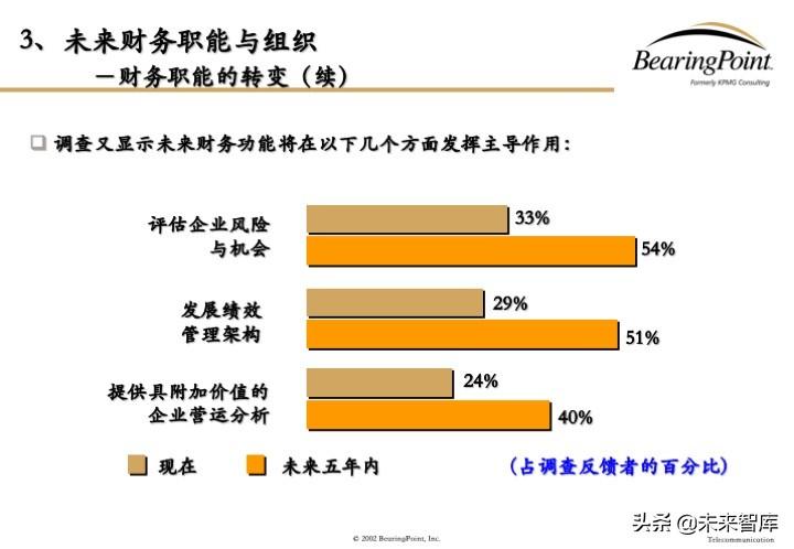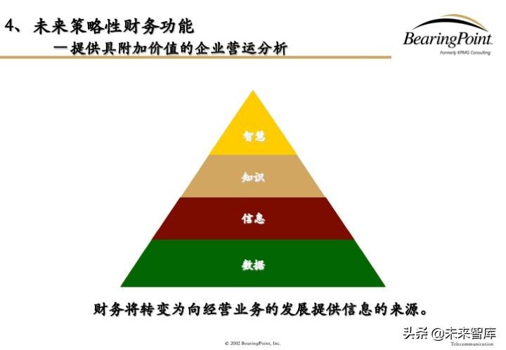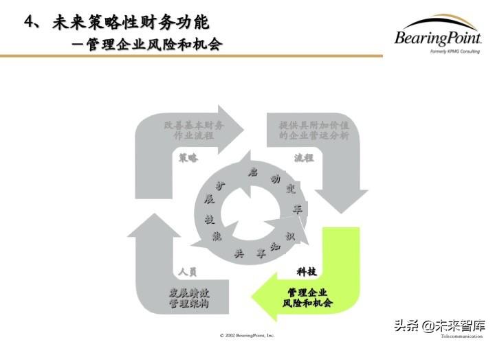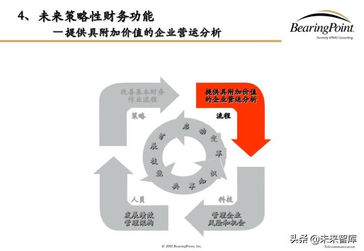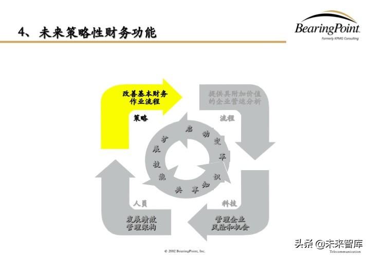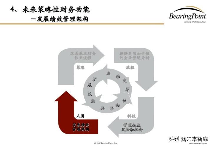 4、未来策略性财务功能:改善基本财务作业流程,提供具附加价值的企业营运分析,管理企业风险和机会,发展绩效管理架构,启动变革、共享知识、扩展技能;
