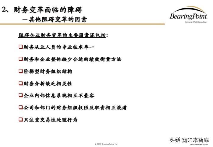 2、财务变革面临的障碍:财务功能资源的分配,营运成本收入的配比,变革需要大量的时间,其他阻碍变革的因素;