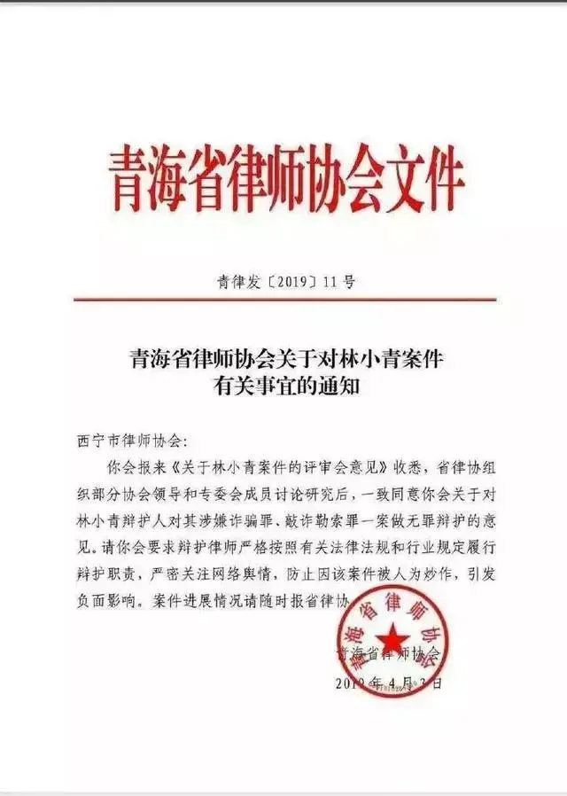 4月3日,青海省律师协会曾经向西宁市律师协会发文,经讨论研究后,“一致同意你会关于对林小青西辩护人对其涉嫌诈骗罪、敲诈勒索罪一案做无罪辩护的意见”。