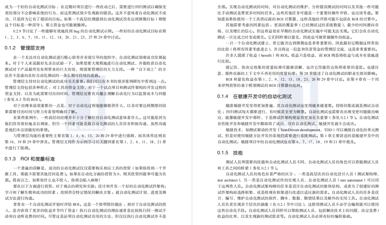 三个小故事/375需要更多对自动化的理解1378自动化测试的第一天1379尝试开始实施自动化/384与管理层作斗争/385探索性测试自动化:数据库记录锁定/387在嵌入式硬件-软件计算机环境中进行测试自动化所得到的教训/392传染性的时钟/395自动化系统的灵活性1 397使用过多工具(跨部门的支持不够)的故事/398成功的案例却有着意料之外的结局/401合作能够克服资源的限制1404取得了大规模成功的自动化过程1405测试自动化并不总是像看上去那样1409部分内容截图
