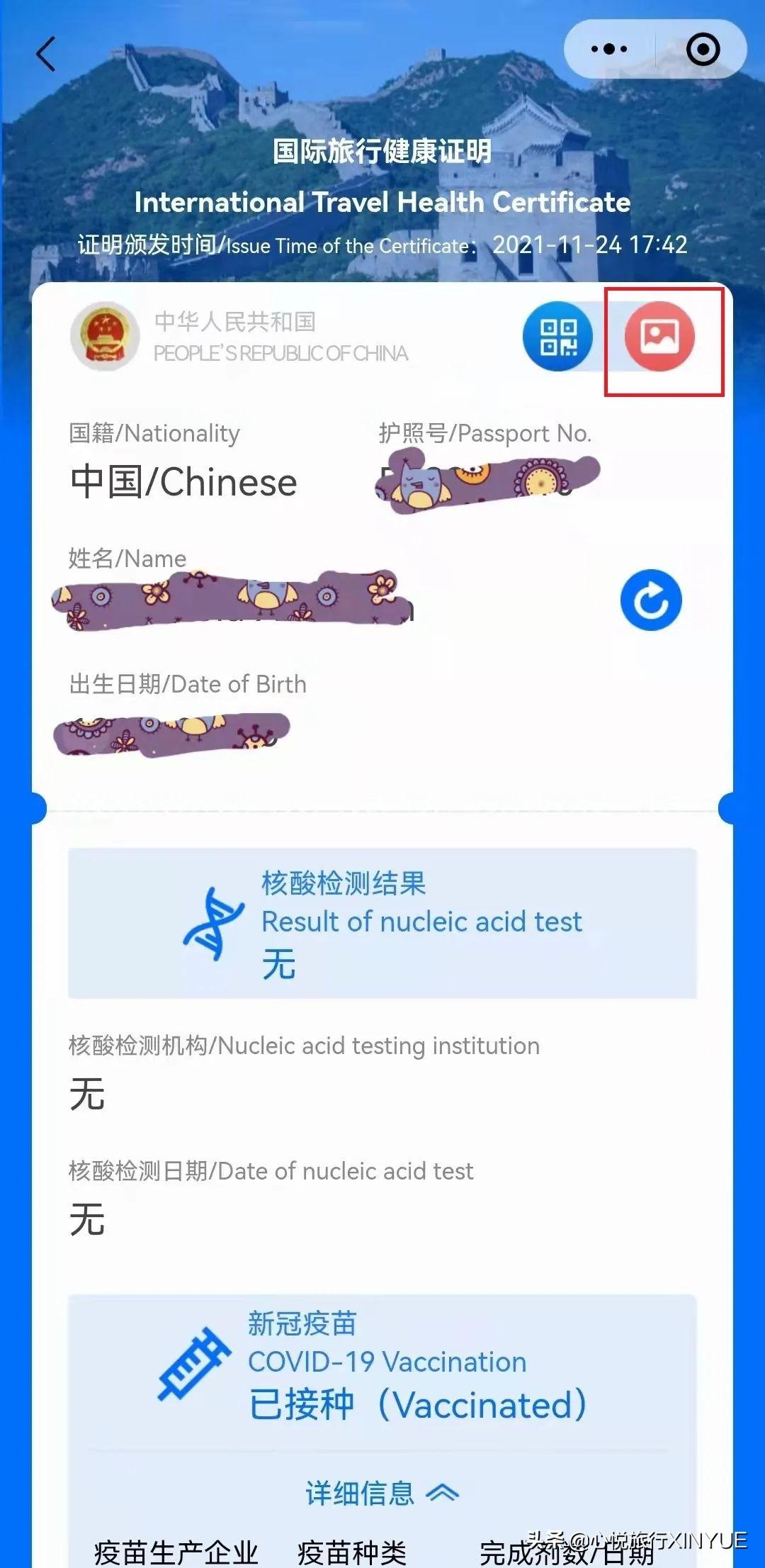 跳出国际旅行健康证明,点击右上角的图片。