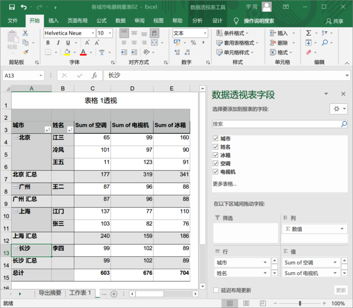 这样就能看到每位销售人员在不同城市以及总计的销量了,如果在行中直接去掉城市这一字段仅保留姓名,就能直接看到每位销售不同产品的情况了。