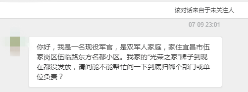 网友私信@宜昌发布 微博:我是一名现役军官,是双军人家庭,家住宜昌市伍家岗区伍临路东方名都小区。我家的“光荣之家”牌子到现在都没发放,请问能不能帮忙问一下到底归哪个部门或单位负责?