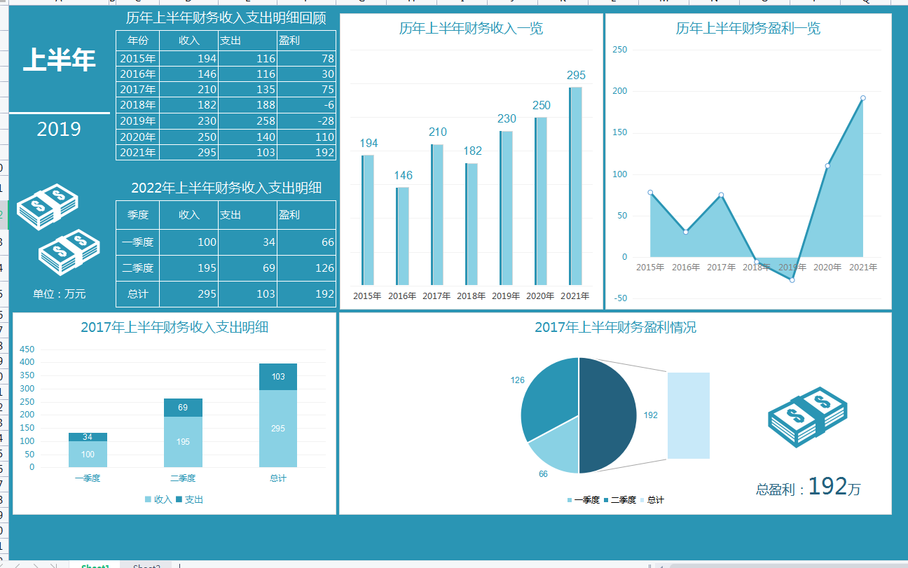 2、全自动excel上半年利润分析表可视化分析模板