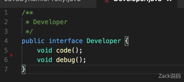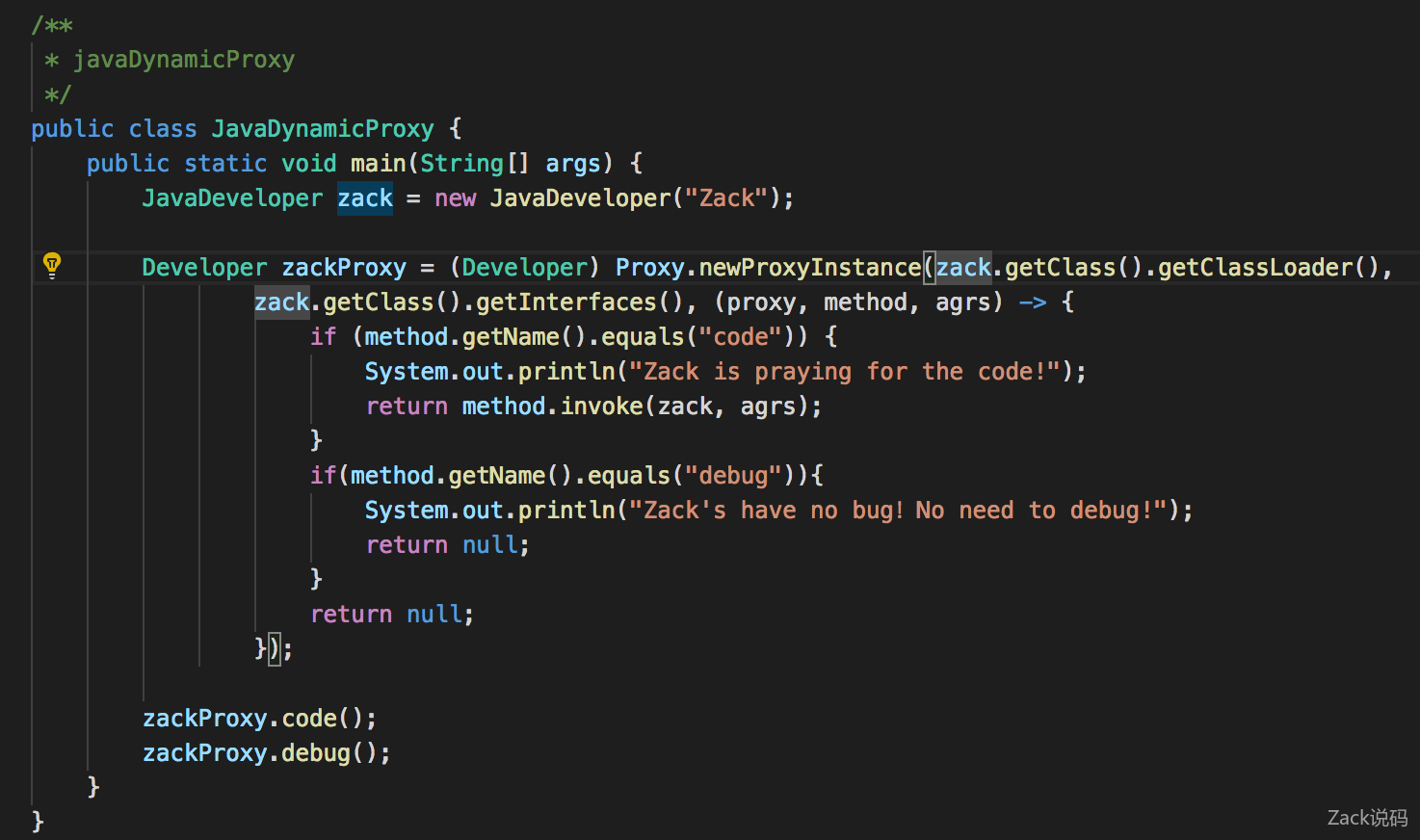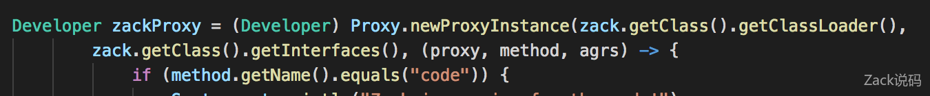 有没有留意到zackProxy的类型是Developer接口,而不是一个实现类。因为zack在被代理后生成的对象,并不属于Developer接口的任何一个实现类。但是它是基于Developer接口和zack的类加载代理出来的。
