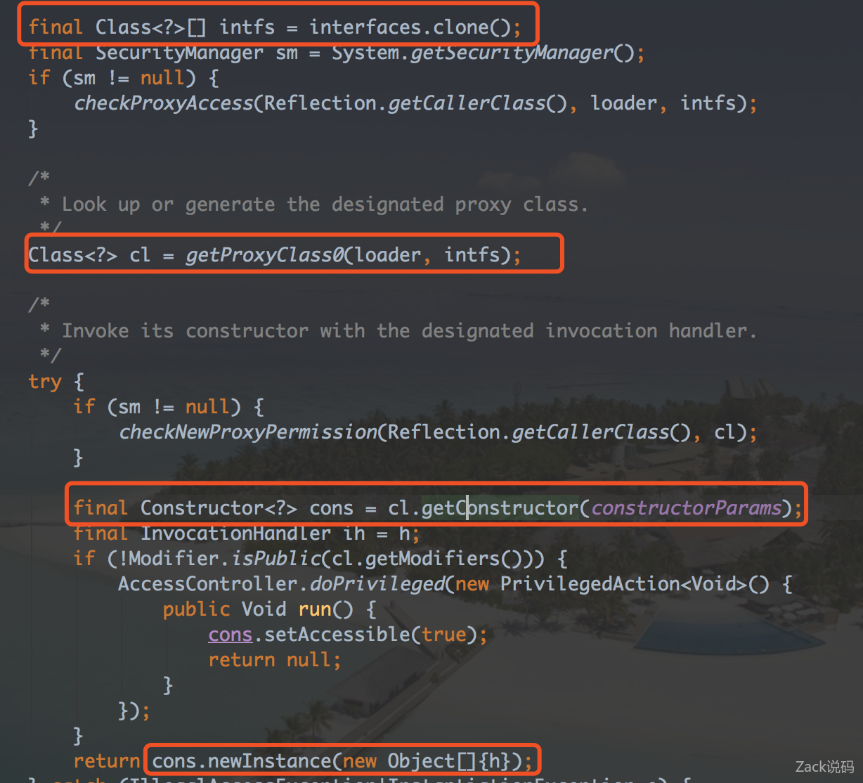 其实大概就是把接口复制出来,通过这些接口和类加载器,拿到这个代理类cl。然后通过反射的技术复制拿到代理类的构造函数(这部分代码在Class类中的getConstructor0方法),最后通过这个构造函数new个一对象出来,同时用InvocationHandler绑定这个对象。