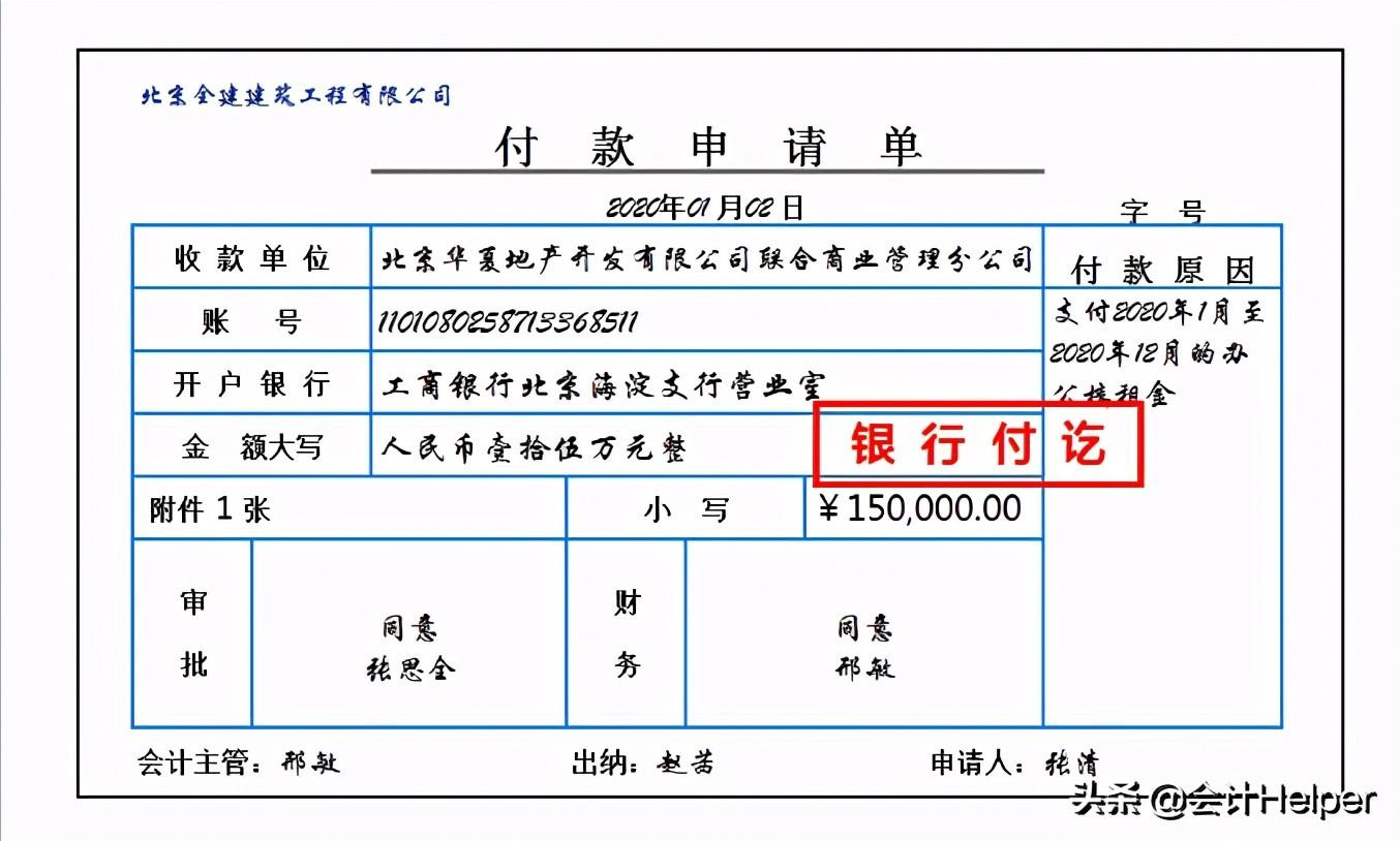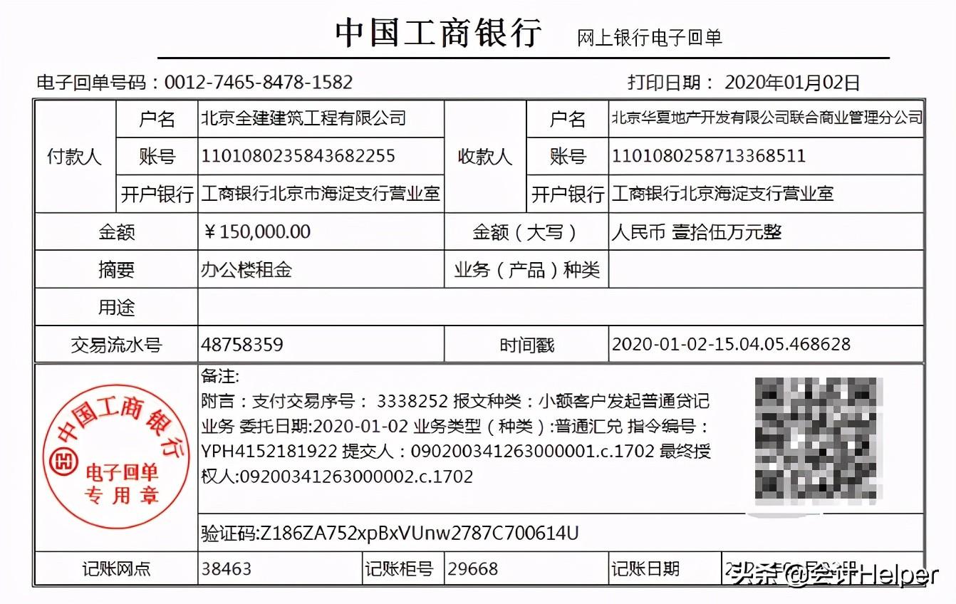 2020年01月02日,预付办公楼1年期租金150,000元,取得增值税普通发票,以银行转账支付。