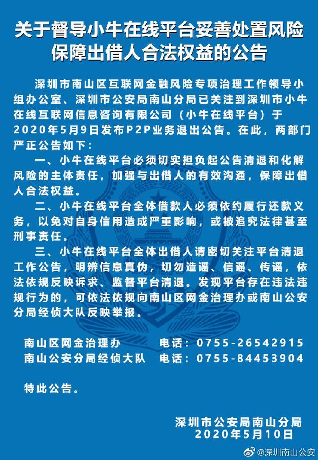 而深圳市南山区网金治理办、深圳市南山公安分局经侦大队也同步发表公告,称: