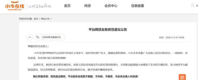2020年5月9日,小牛在线网贷平台宣布要良性退出,平台累计成交金额过千亿元。