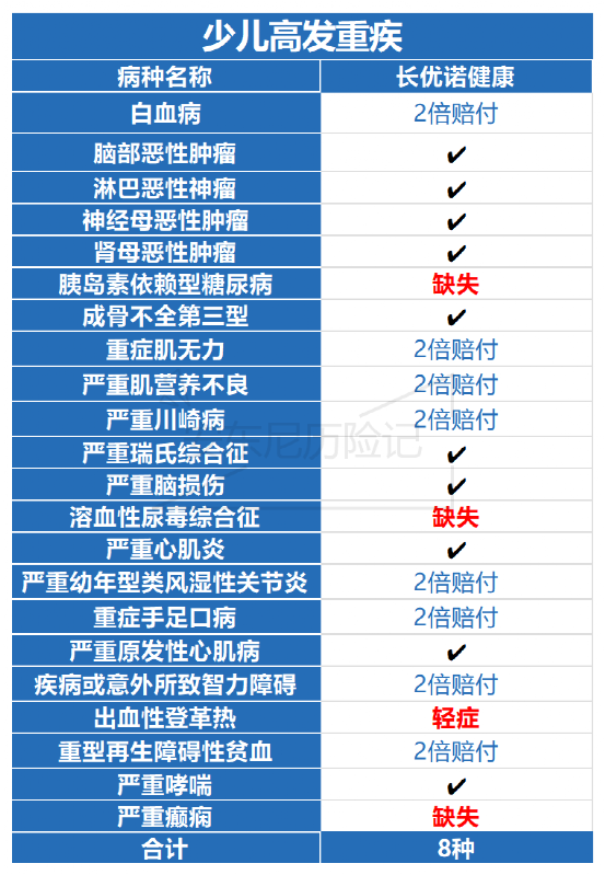 但是对于Ⅰ期糖尿病,长生优诺健康是直接连重疾里面都没有涵盖。这个也是很常发生在少儿阶段的慢性病。