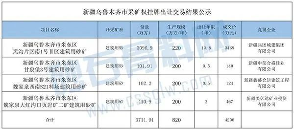 从自然资源部获悉,新疆乌鲁木齐市米东区四宗建筑用砂矿出让成功,合计资源储量近4000万方,合计生产规模820万立方米/年。其中甘泉堡3号建筑用砂矿和魏家泉西南S21料场建筑用砂矿出让年限均为6个月,年产规模达200万立方米。