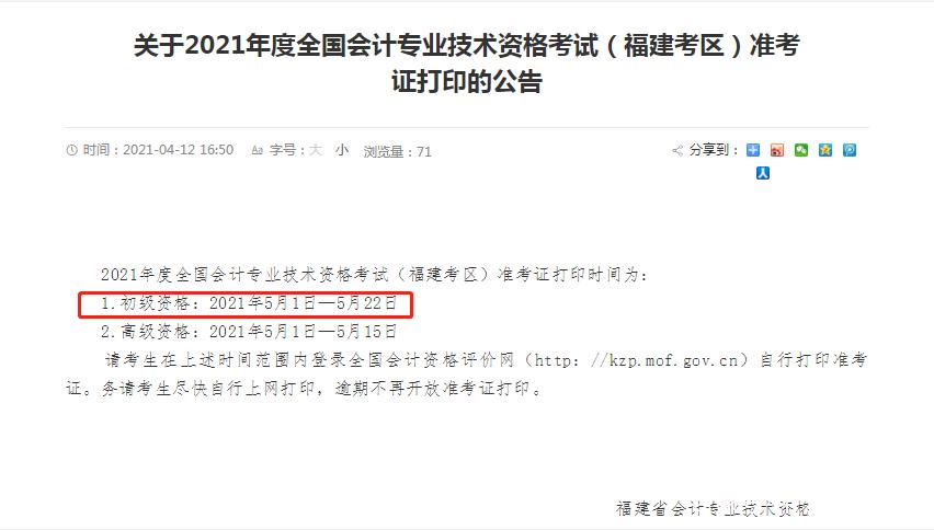关于2021年度全国会计专业技术资格考试(福建考区)