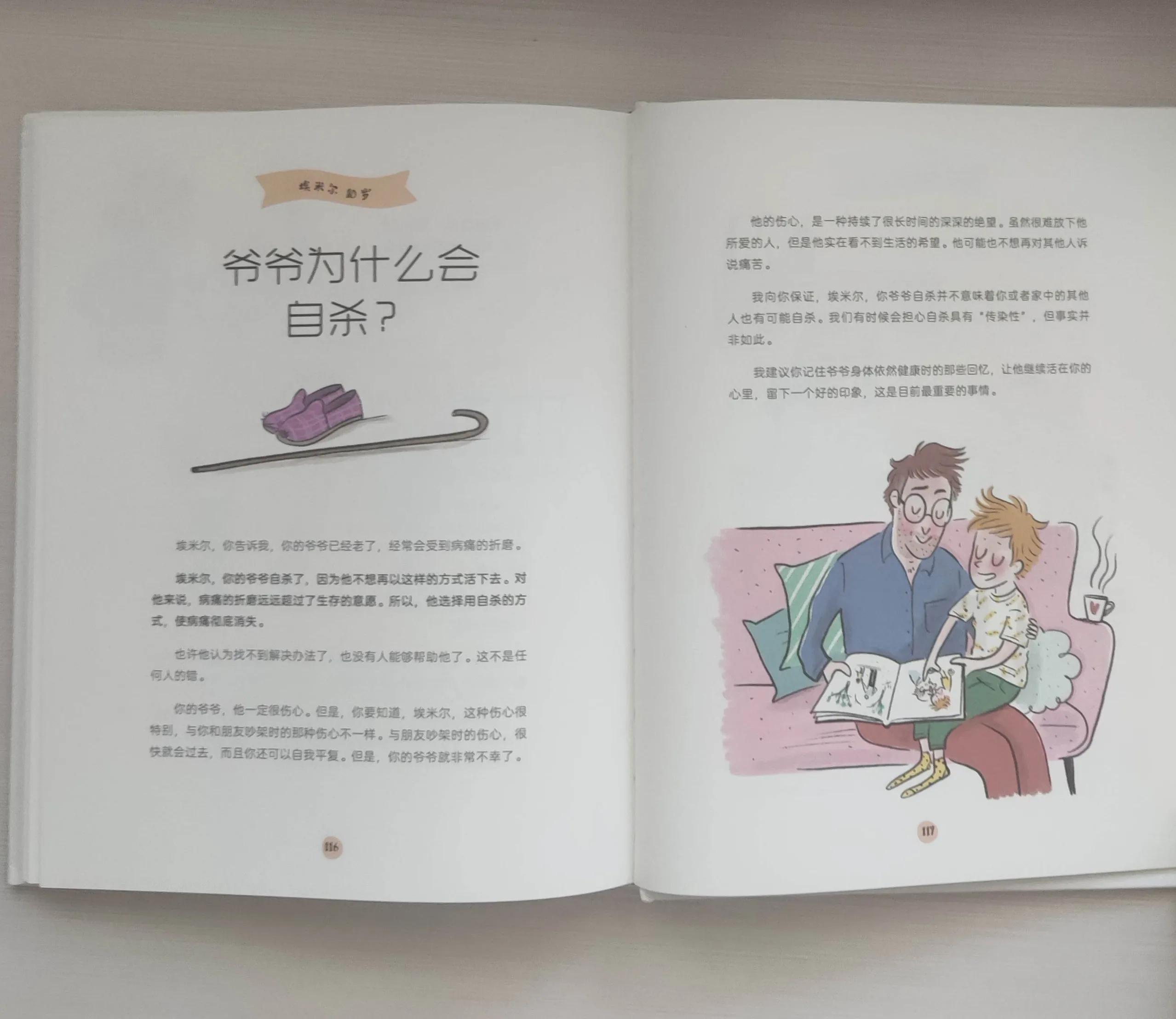 但作者敏锐地觉察到孩子的担心,所以在开诚布公地探讨了“爷爷可能年纪太大了、身体不好,对自己好起来这件事陷入了绝望,所以选择了离去”等可能的原因后,特别提醒说:“但是这并不意味着家里的其他人也会自sha,这件事是不会传染的,你不用担心。”