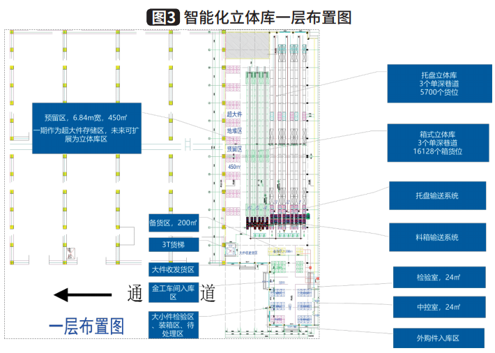 一是新建了层高为18米的智能化立体库。其中包括占地面积为2596平方米的仓储用房,以及3T货梯、供电、消防、环保等附属设施。库区划分为外购件入库区、中控室、检验室、装箱区、待处理区、金工车间入库区、大件收发货区、备货区、预留区、3T电梯、托盘立体库区(3个巷道,5700个货位)、箱式立体库区(3个巷道,16128个货位)。