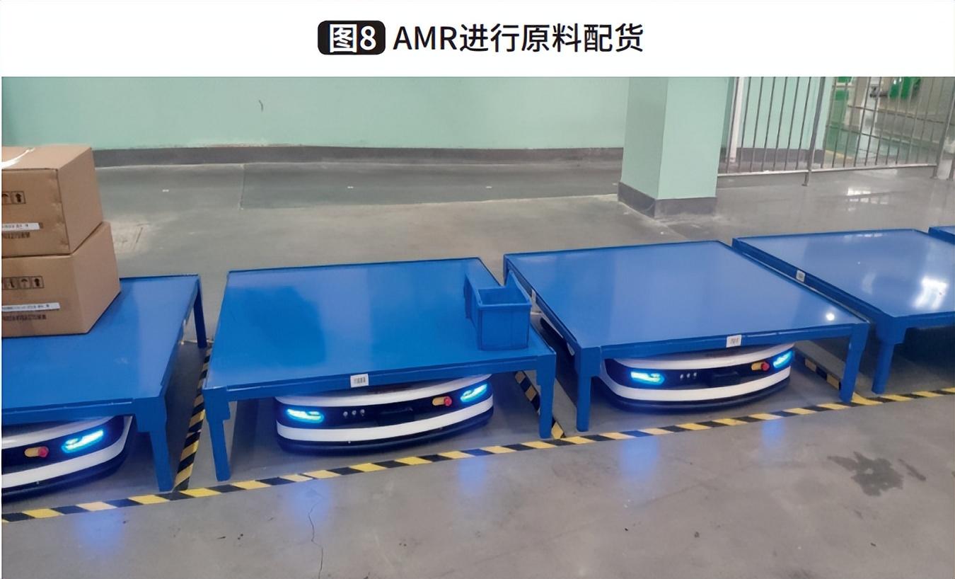 三是实现物料自动拣选配货。4台AMR移动机器人进行物料从仓库到产线的自动搬运作业。