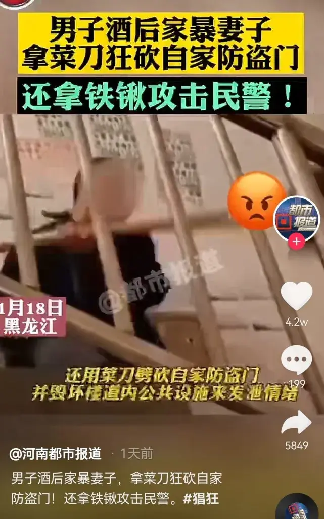 1月18日,黑龙江徐某君在喝醉酒后对妻子家暴,用菜刀砍自家的防盗门,并且毁坏楼道内公共设施来发泄自己愤怒的情绪。