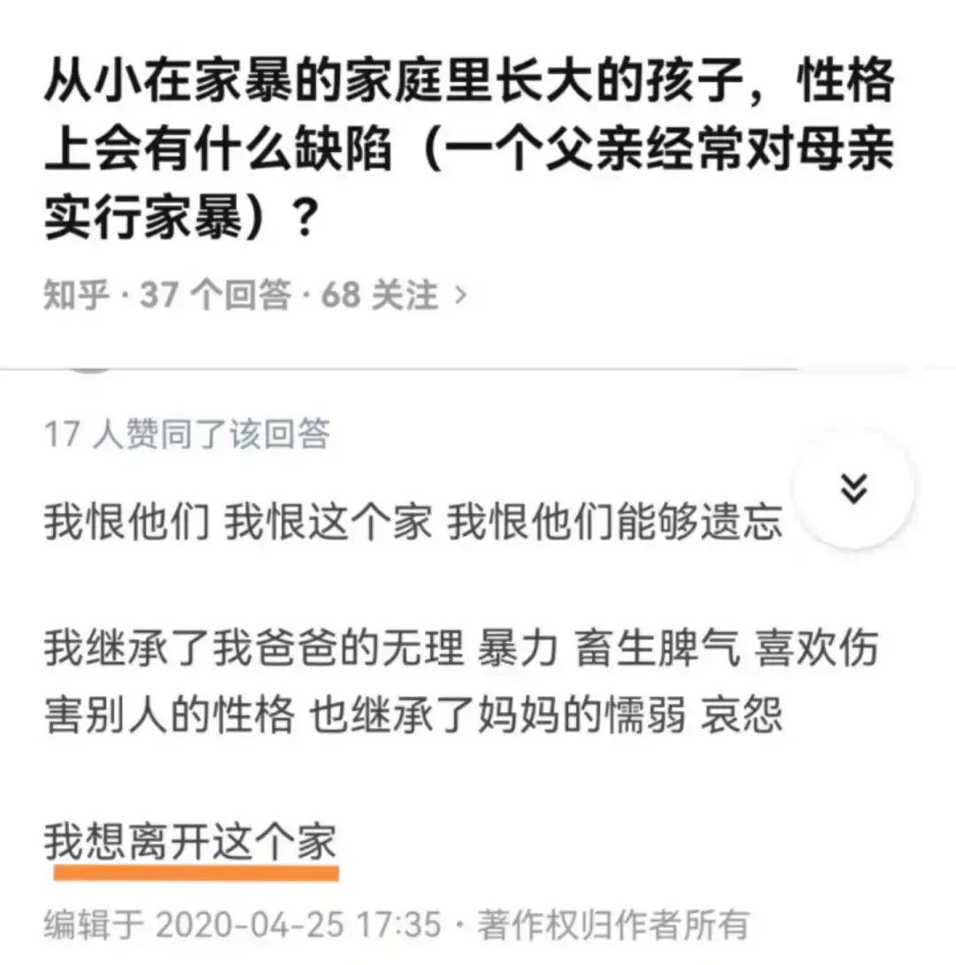 知乎上有一个问题,从小在家暴家庭里长大的孩子,性格上会有什么缺陷?