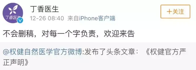 26日一早,丁香医生微博转发回应权健“声明”,表示“不会删稿,对每一个字负责,欢迎来告”。
