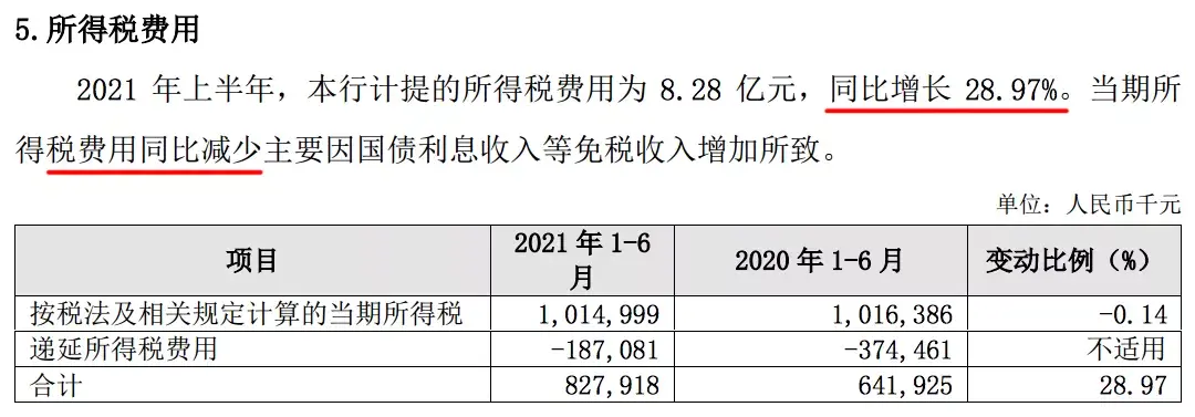 这个业绩看起来不错,且该行净利润还是在所得税费用增长的前提下保持了两位数增长。数据显示,2021 年上半年,该行计提的所得税费用为8.28 亿元,同比增长28.97%。