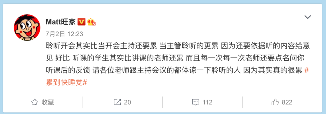 开会打瞌睡,发一条微博,标签是“累到想睡觉”。