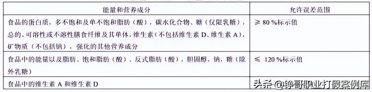 GB28050-2011第6条(营养成分的表达方式)中6.4规定,“在产品保质期内,能量和营养成分含量的允许误差范围应符合表2的规定”。其中,食品中的能量以及脂肪、饱和脂肪(酸)、反式脂肪(酸),胆固醇,钠,糖(除外乳糖)含量的允许误差范围≤120%标示值。这就是一个营养成分表达误差的问题,一个标签标示问题。标示值与实测值相差±20%之内,就符合规定,就被允许;标示值与实测值相差超出±20%,就不符合规定,就不被允许。
