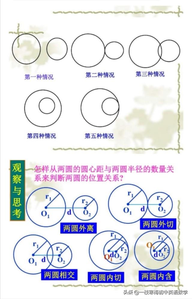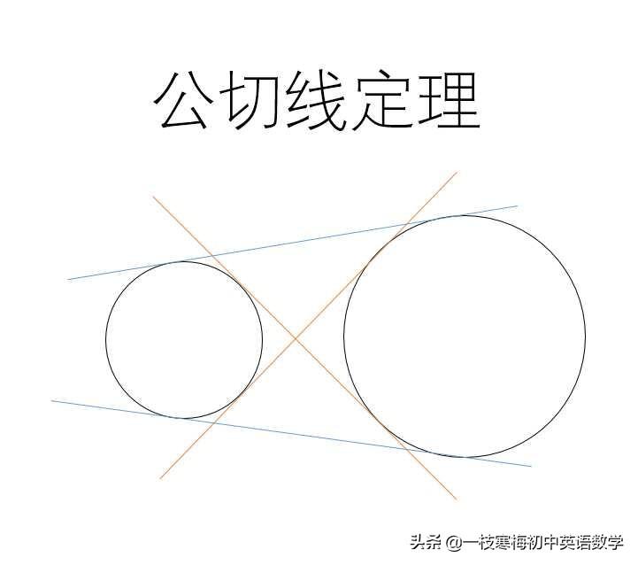 6、公切线长定理:如果两圆有两条外公切线或两条内公切线,那么这两条外公切线长相等,两条内公切线长也相等。如果他们相交,那么交点一定在两圆的连心线上。