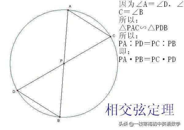 7、相交弦定理:圆内两条弦相交,被交点分成的两条线段长的乘积相等。