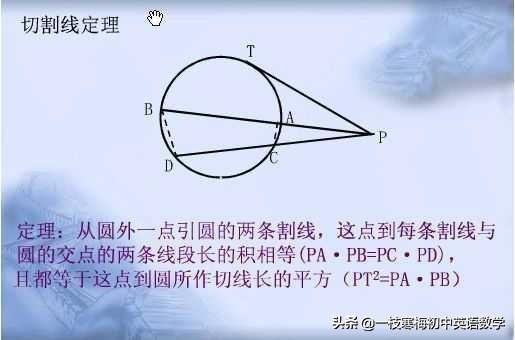 9、割线长定理:从圆外一点向圆引两条割线,这一点到每条割线与圆的交点的两条线段长的积相等。