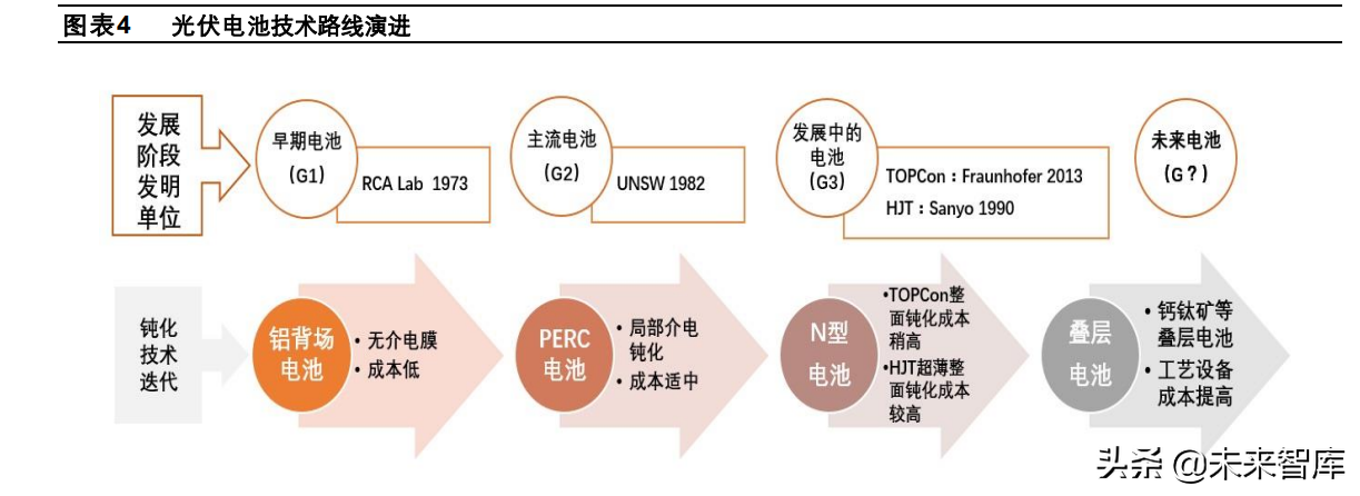 效率与成本优势显著,支撑着 TOPCon 电池在后 PERC 时代率先占据扩产高点。TOPCon 可基于 PERC 技术积累、人才 储备和成熟设备的积淀进一步发展,同时投资成本相较于其他 N型电池技术更具有经济性,单 GW 设备投资低于 HJT和 IBC 电池,且可通过改造升级 PERC 产线(费用约 0.5 亿元/GW)拉长原有设备生命周期。此外,TOPCon 具有可观的发展潜 力,目前平均量产效率约 24.5%+,晶科创造的实验室效率纪录为 25.7%,理论效率可达 28.7%(双面)。TOPCon 技术拥 有完整的可持续发展的技术路线支撑,可应用选择性发射极/激光硼掺杂技术降低发射级钝化区域的复合损失和载流子传输 损失,同时通过大尺寸薄片化、银铝浆替代、设备降价等途径进一步降本。后续,TOPCon 可与 IBC 技术结合形成 TBC (POLO-IBC)技术,量产效率达26%-28%,还可实现与钙钛矿结合的叠层电池,迭代升级空间广阔。(报告来源:未来智库)