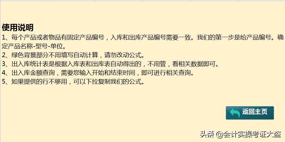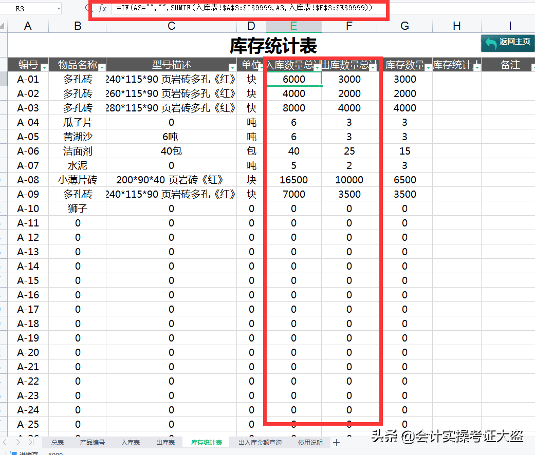 操作说明:出入库统计表是根据入库表和出库表自动得出的,不用管,看相关数据即可。