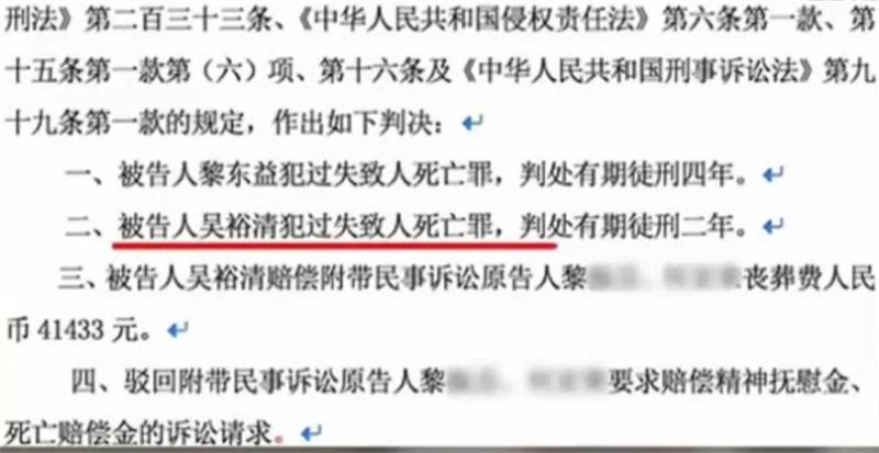 最终,一审法庭判处吴老汉有期徒刑两年,赔偿死者黎晓亮家属4万余元。