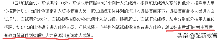 ①河南农信社的笔试满分100分,笔试成绩按照60%的比例计入总成绩。根据用人单位各专业报名人员的笔试成绩从高到低,按照用人单位各专业招聘计划1︰2的比例确定进入资格复审人员,笔试成绩末位并列的均进入资格复审环节。