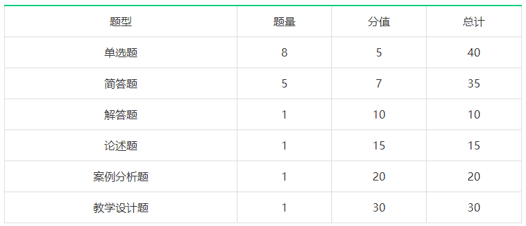 根据资格证考试的特点,数学科目三的试卷结构不会出现太大的变化,满分依旧是150分,从考试题型上来看,仍然沿袭了往年的单项选择题、简答题、解答题、论述题、案例分析题和教学设计题六大题型,图兔贴心的为大家做了如下表格: