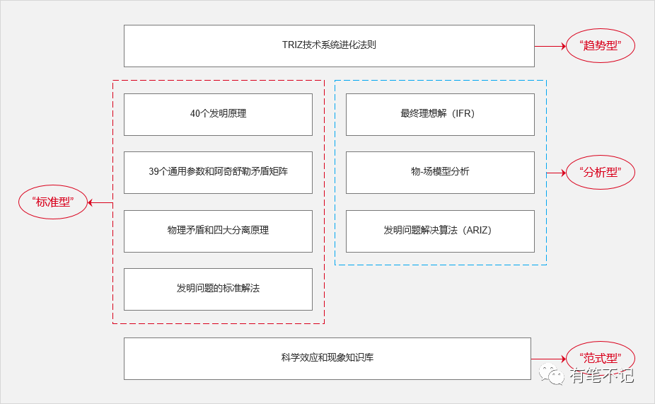 按理论的类型,可以将其分成四大类:趋势型,分析型,标准型和范式型。其中,趋势型是对技术系统趋势的研究,分析型是对思路和方法的研究,标准型是对通用问题通用解的研究,范式型是对不同行业的科学范式研究。