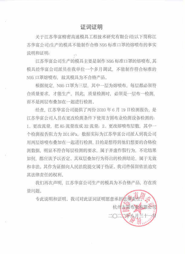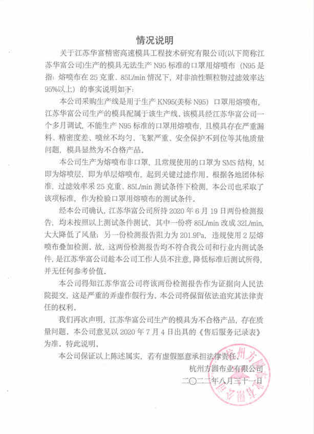 “关于江苏华富精密高速模具工程技术研究有限公司(以下简称江苏华富公司)生产的模具无法生产N95标准的口罩用熔喷布(N95是指:熔喷布在25克重、85L/min情况下,对非油性颗粒物过滤效率达95%以上)的事实说明如下: