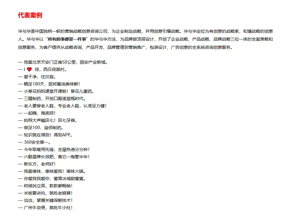 华与华的代表性案例还有:“小葵花妈妈课堂开课啦!”“专业老人鞋,认准足力健”“爱干净,住汉庭”等等。