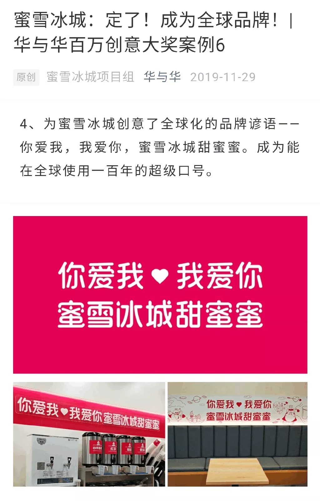 这个logo和“你爱我,我爱你,蜜雪冰城甜蜜蜜”的口号都是华与华公司搞的。