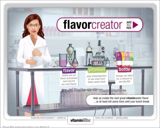 美国饮料品牌Glacéau(酷乐仕)为了设计一种具有健康形象的维生素饮料,在Facebook上通过App软件“Flavor Creator”,策划了一场成功的研发众包活动。3个月内,超过100万人在活动页面上从玩游戏、回答问题开始,逐步参与到产品研发过程中:投票评选自己喜欢的风味,设计产品名称与标签,描绘产品应有的功能和卖点。获胜产品——一款加入咖啡因和维生素的黑樱桃-柠檬风味水,不久后真就上市销售。