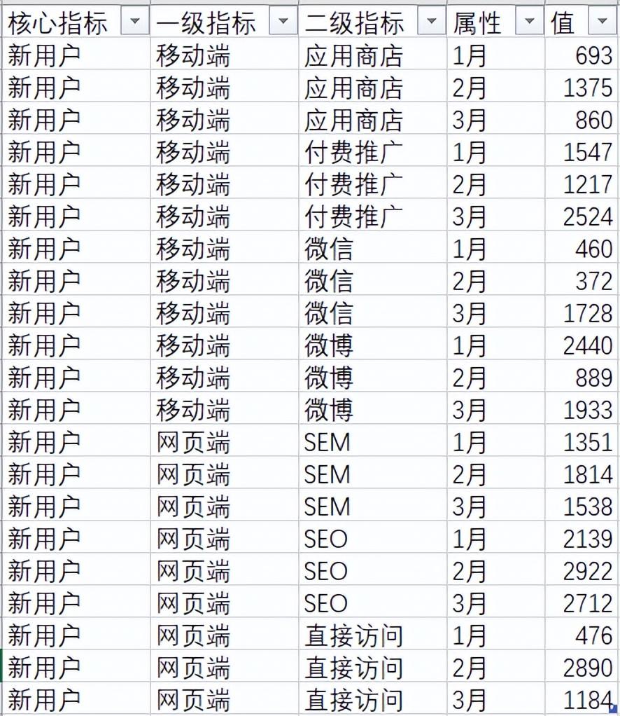我们要得到网页端和移动端在不同推广渠道的每个月的客户数是多少,在数据透视选项卡中将一级指标、二级指标、月份拖入行,新增客户数拖入到值。