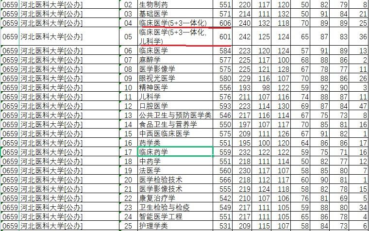 还有,河北医科大学的5+3临床医学的投档线是606,儿科5+3临床医学的投档线是601。这个投档线超过河北工业大学的最高投档线。上面说了河工大的最高投档线是599分。