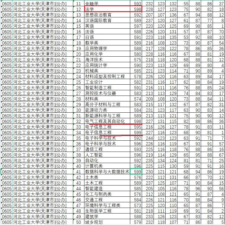 刚才我们看到河北工业大学的投档线情况,法学的投档线是598分,比大数据的599分低一分,在河工大的投档线中排第二。