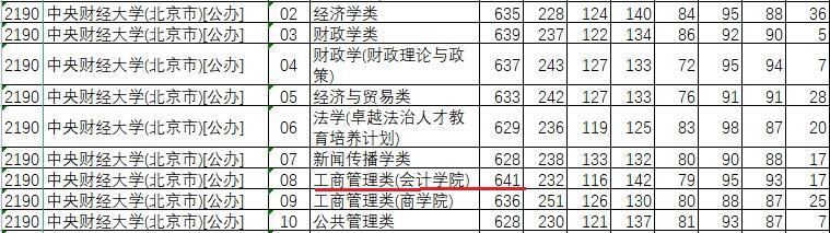 对于选历史的考生来说,会计很受欢迎。下图是中央财经大学的投档线,会计学院的工商管理的分数最高,641分。