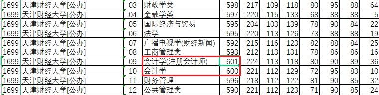 下图的天津财经大学,同样,会计的投档线最高,601和600分。