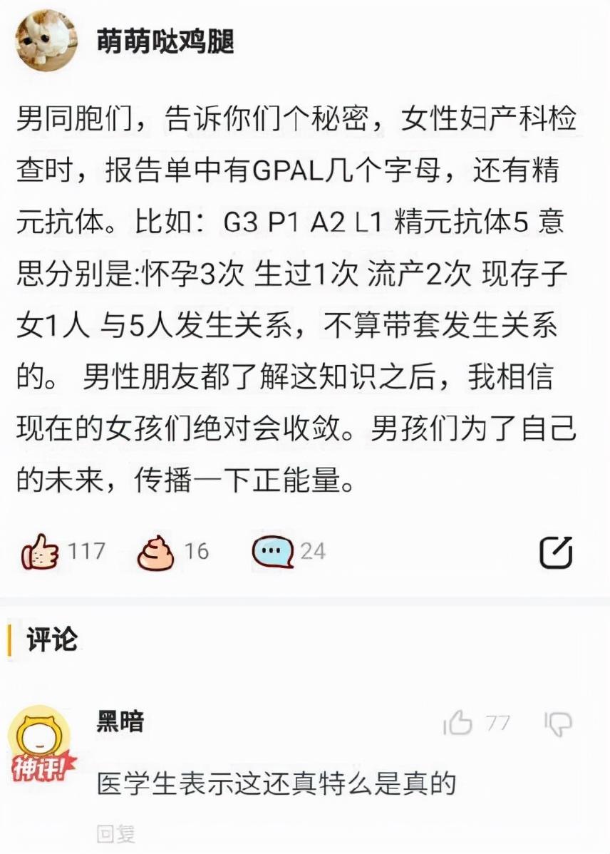 图片的重点信息是从女性妇科检查报告中GPAL几个字母和精元抗体的数目,就可以判断出该名女性的孕产史,更“神奇”的是连她和多少位男性发生过性关系都能检测出来。这中间有什么科学原理吗?